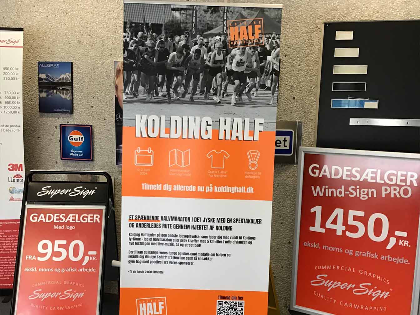 Vi er leverandør af det største sortiment på markedet af bl.a. roll-ups, skilterammer, messesystemer og beachflags. Du får et færdigt produkt i god kvalitet, lige til at sætte op i butikken eller på messen.